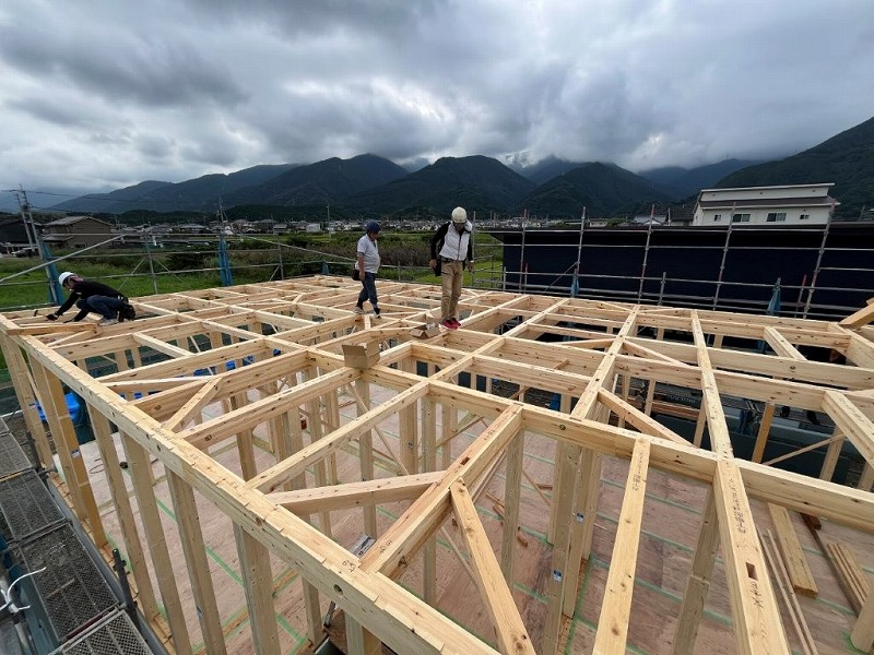9月末に上棟を行いました。下の写真は、梁と桁を組み上げたところです。