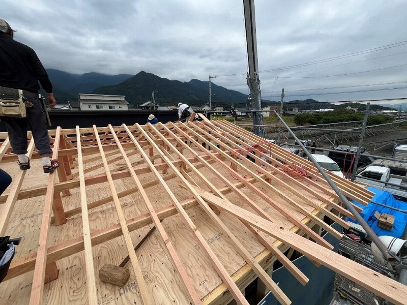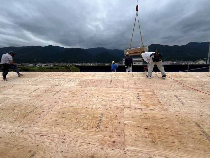 垂木の上に野地板(屋根の下地材)を貼っていきます。これで屋根の構造が完成です。