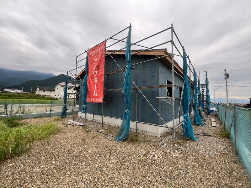 続いて、家の外側にぐるりと耐力面材を施工していきます。ぐっと家らしくなってきました。最後にアイワホームの看板シートを取り付けて、上棟完了です。