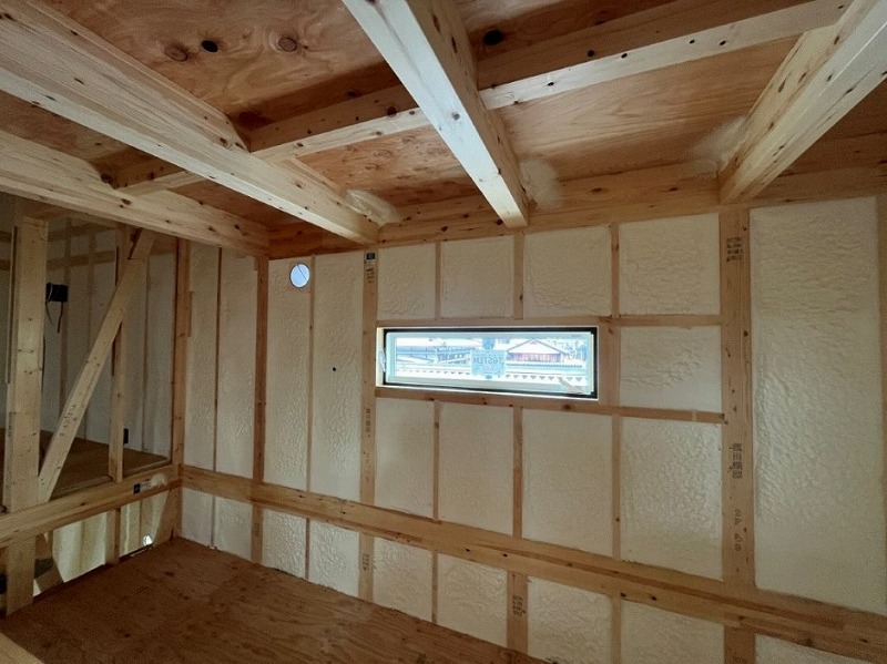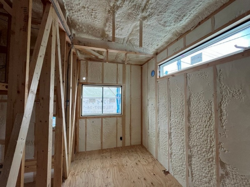 こちらは2階洋室(1)の写真。壁にも天井にも、ウレタンフォームをたっぷりと吹き付けています。