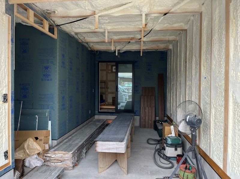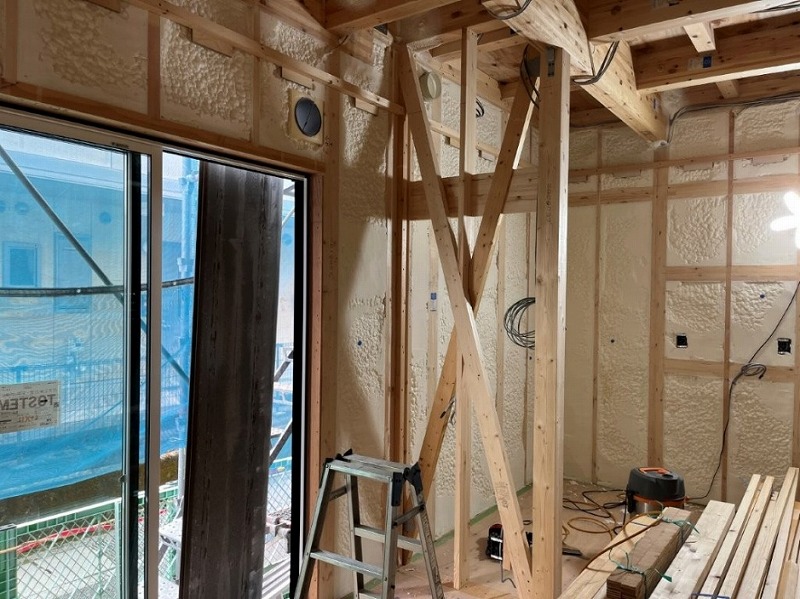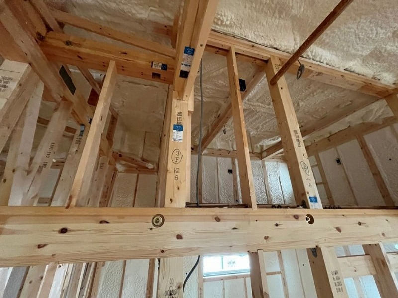 工事は順調に進み、9月中旬には断熱工事を行いました。アイワホームでは、標準仕様の断熱材として現場発泡ウレタンフォームを採用しています。壁に吹き付けた瞬間に約100倍に発泡して、電気配線や金物類のわずかなすき間にも入り込むため、断熱欠損のない高い断熱性能が実現できます。