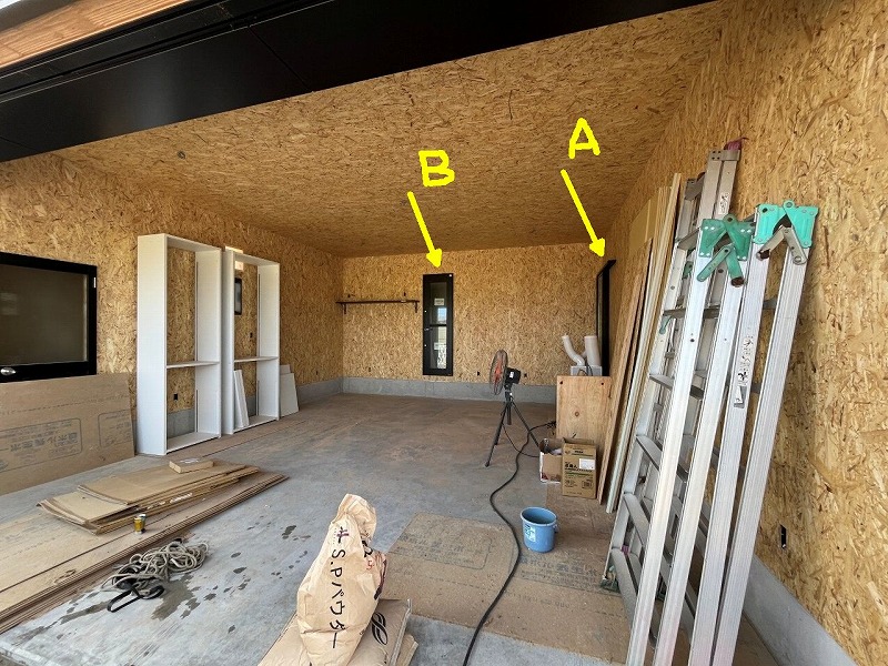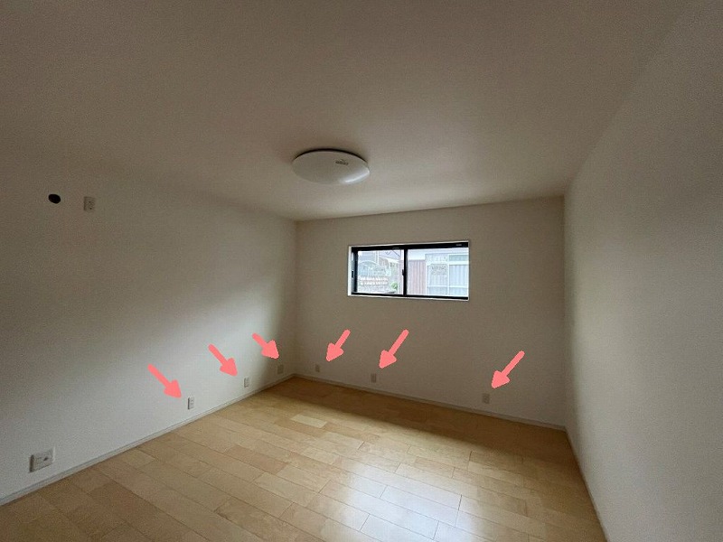 写真は、先日完成した中村・F様邸のセカンドリビングです。矢印が6つありますが、その先はすべてコンセントです。そう、この部屋には「延長コードを使いたくない」というF様のご要望により、たくさんのコンセントが設置されています。