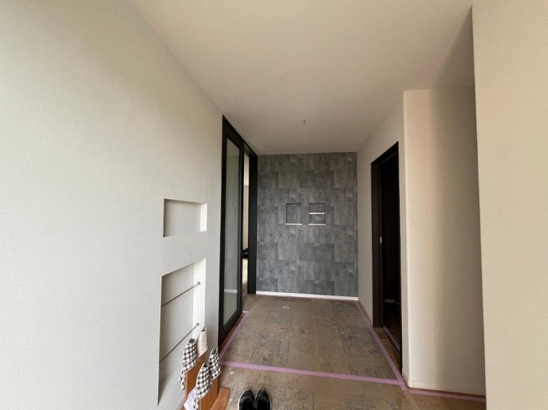 Y様邸のもうひとつの特徴は、あちこちに作ったニッチの数々。下の写真は玄関ホールですが、左の壁にスリッパ掛け用のニッチと、その上に鍵を掛けるためのニッチを作っています。正面のアクセントウォールにも2つニッチを作っています。