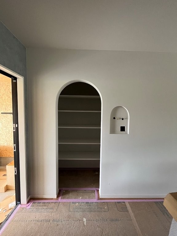 パントリーの入口は、アール(曲線)の下がり壁を採用しています。その右側に、同じ形のニッチを造作しています。2つ並んでいると、なんだかかわいいですよね。ちなみに左側に見えているドアが、冒頭に書いた物置へとつながるドアです。