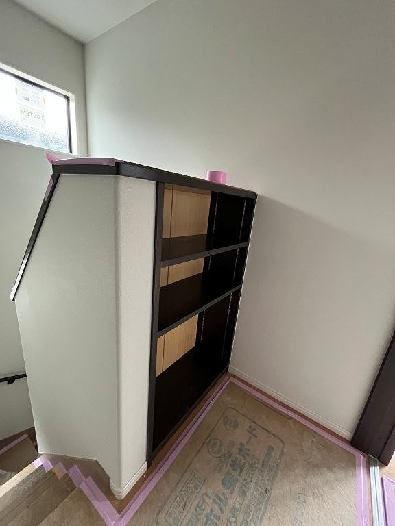 2階の階段ホールの写真です。ここにはニッチではなく、腰壁の厚みを利用して、しっかりした造りの本棚をつくっています。