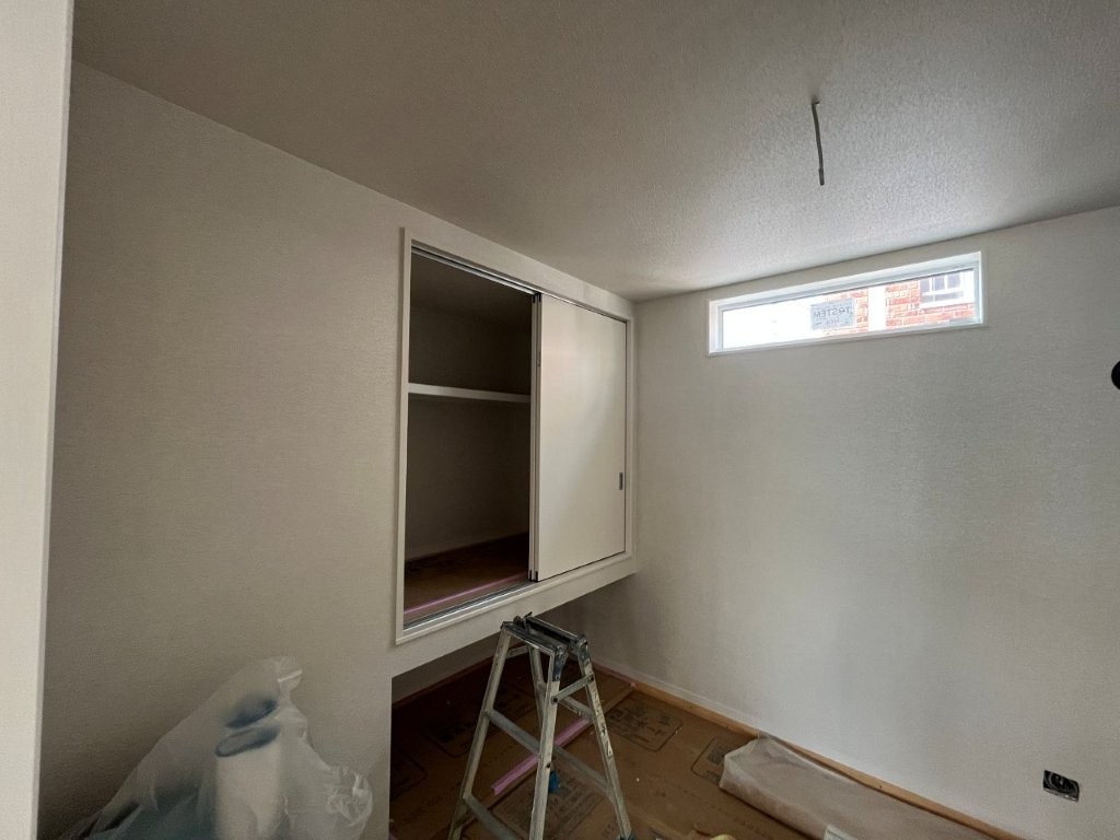 実はこれ、電気工事屋さんへの注意喚起の印です。「この場所にニッチを造作するので、配線の際はこのスペースを空けておいてね」という意味合いです。作業ミスを防ぐ、ちょっとした工夫というわけです。