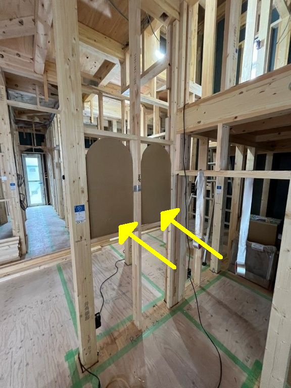 下の写真は、大工工事が進むI様邸の屋内の様子です。矢印が指している、縦長のかまぼこの断面のような板は、いったい何かわかりますでしょうか?
