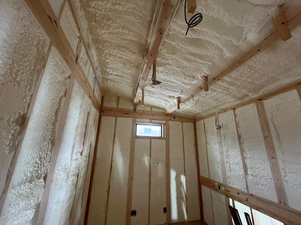 大工工事が一通り終わると、次は断熱工事。壁の中と天井に、たっぷりと発泡ウレタンフォームを吹き付けています。