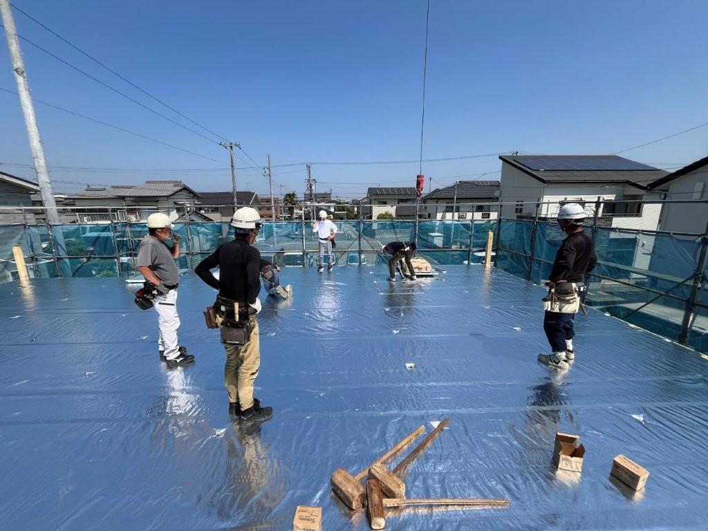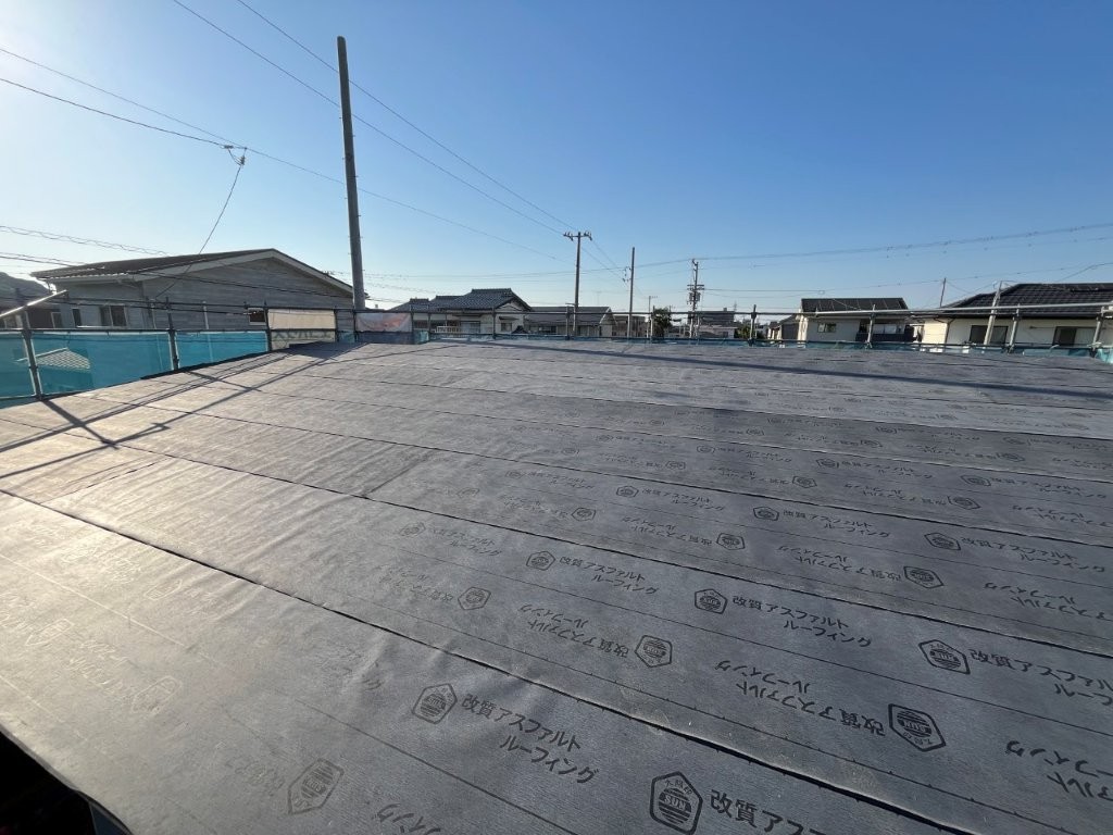 野地板の上にアスファルトルーフィング材(屋根の防水シート)貼っていきます。これで上棟は終了となります。