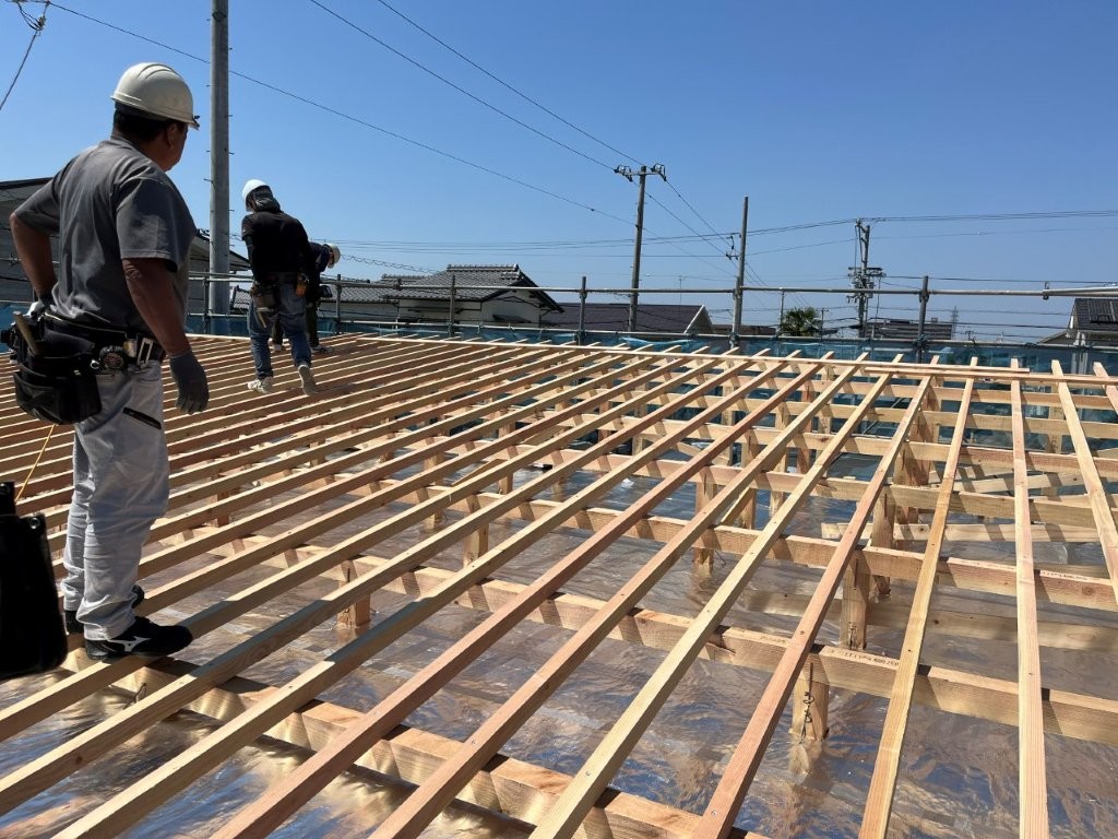 垂木の上に野地板(屋根の下地材)を貼っていきます。