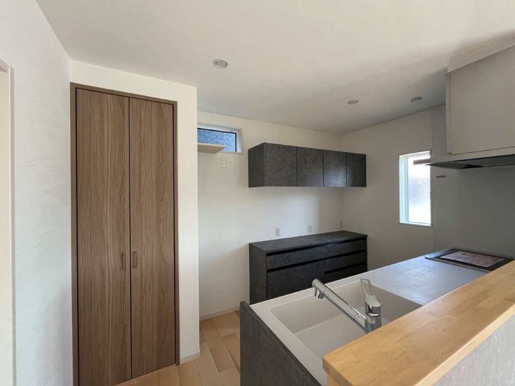 続いてキッチンの写真。清潔感のある使いやすいキッチンに仕上がりました(広角で撮ったため、なんだか小さなキッチンに見えますが、そんなことはありません)。左側の扉はパントリーの扉です。