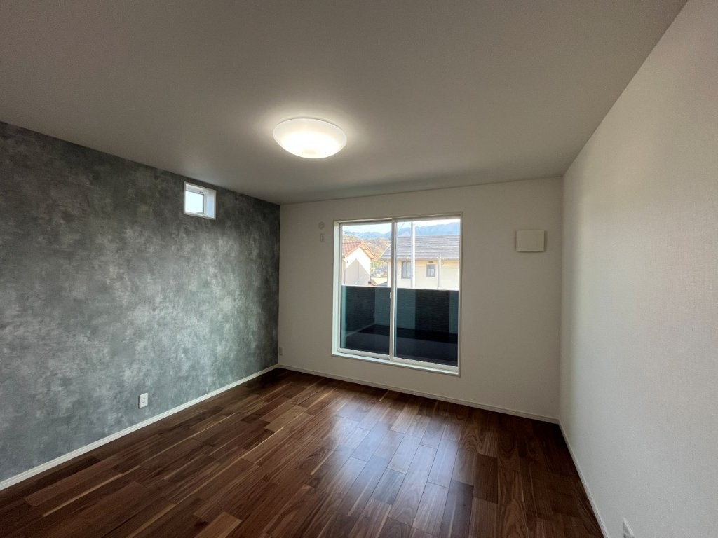 主寝室にはグレーのアクセントウォールと濃い色目の床材を採用しました。寝室らしい、落ち着いた印象です。