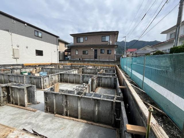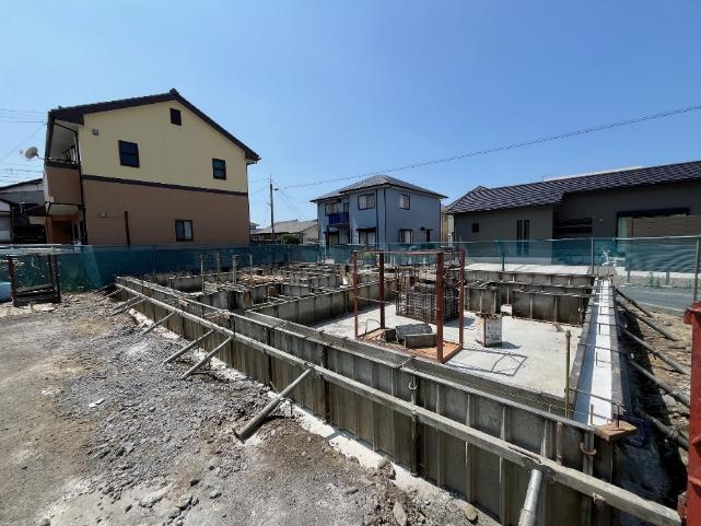 さらにその1週間後の様子です。コンクリートの打設が完了しました。捨てコンクリートのあと、「型枠工事」→「配筋工事」→「配筋検査」→「底面へのコンクリート打設」→「立ち上がり部分の型枠工事」→「立ち上がり部分のコンクリート打設」という工程を経て、ここまで進みました。現在は、コンクリートがしっかりと固まるのを待っている状態です。固まり次第、型枠を外して基礎の完成となります。