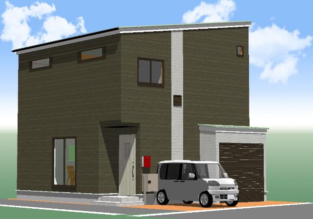 こちらがK様邸の完成予想イメージ図です。外観は一見ふつうの2階建てに見えますが、中に入るとスキップ構造ならではの遊び心あふれる間取りが広がっています。