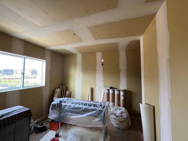 クロス工事が始まりました。下の写真はパテ処理を終えた状態の主寝室です。写真中央にあるのは、壁紙に糊付けを行うための機械で、機械の後ろに並べられているのが、これから貼る壁紙です。準備万端といったかんじです。