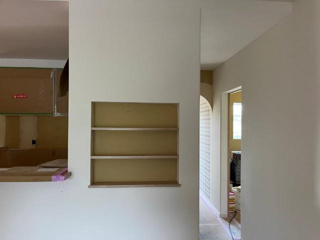 クロス工事が進むキッチンスペース。写真中央は袖壁に作ったニッチ。細かな作業が必要なので、この部分は後回しにしています。写真右奥に少しだけ見えているアールの下がり壁ですが、その向こうはパントリーです。