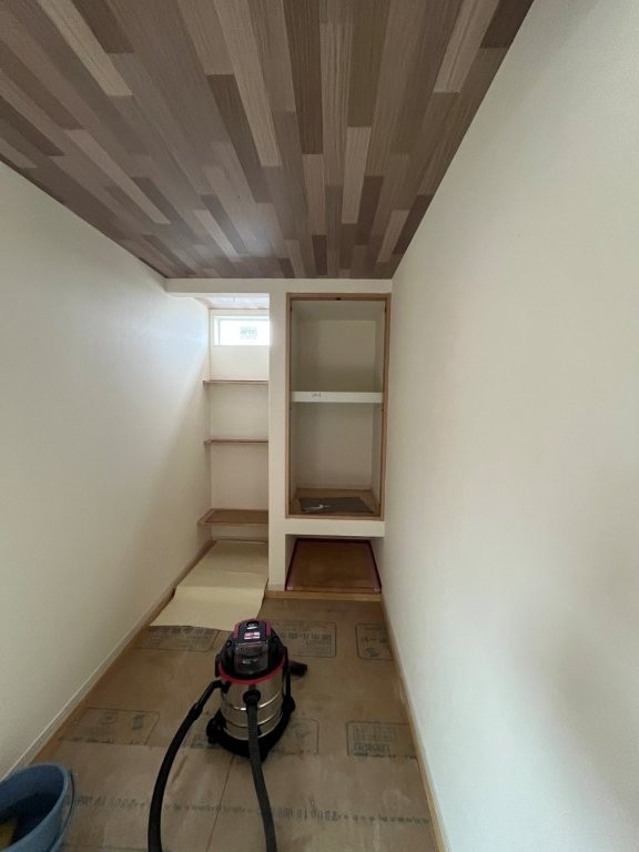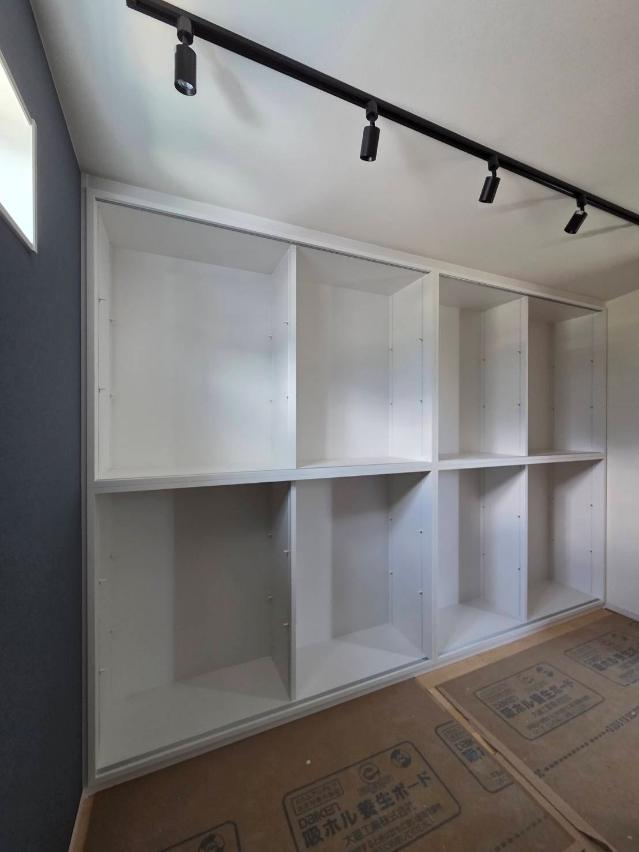 クロスを貼り終えた1.5階のホビールーム。フィギュア模型を飾るための棚を造作中です。ライトアップ用の照明も付けています。