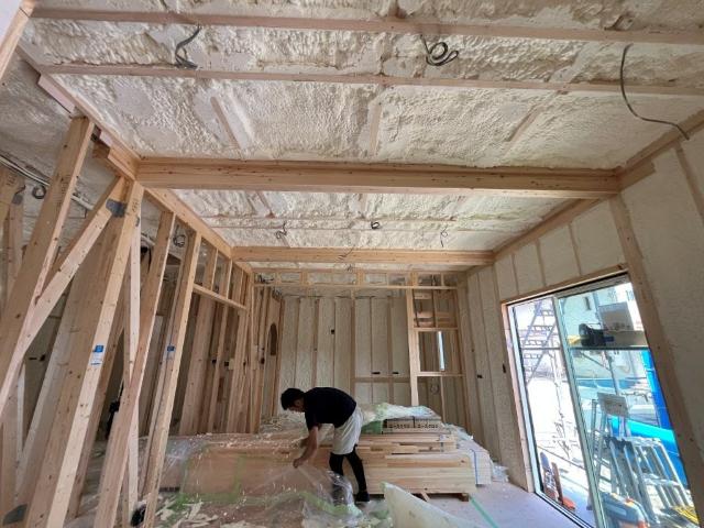 現場打ち合わせを終えると、次に電気の配線工事を行い、その後、ウレタンフォームによる吹き付け断熱工事へと進みます。壁の中にも天井にも、隙間なくたっぷりとウレタンフォームを吹き付けていきます。