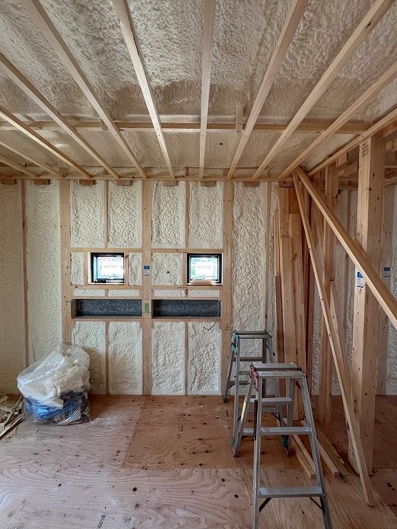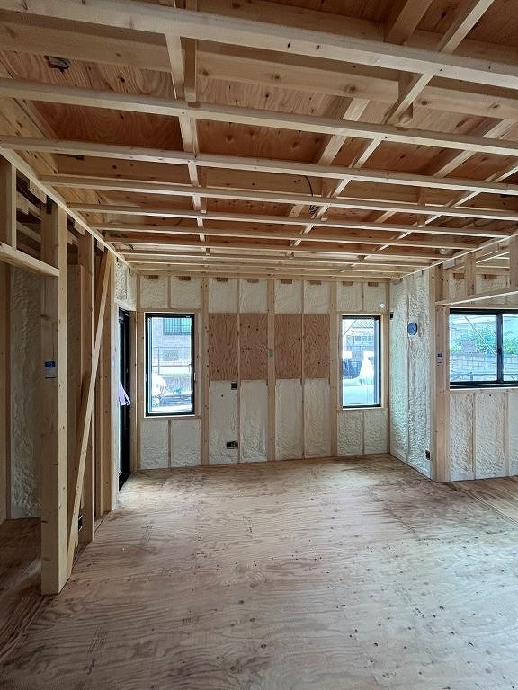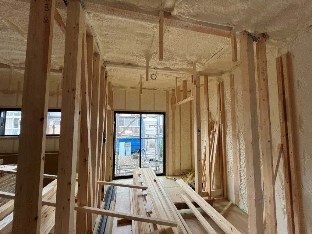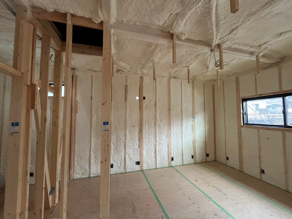 もう一枚、断熱工事完了の写真です。天井にも壁の中にも、発泡ウレタンフォームをたっぷりと吹き付けています。