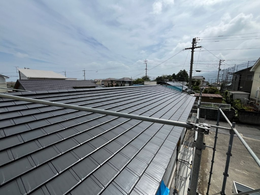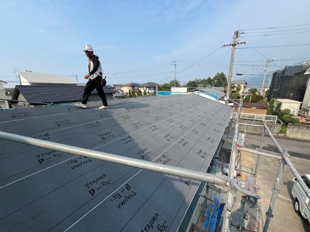 屋根工事も完了しています。最近は屋根材にガルバリウム鋼板を選ぶお客様が多いですが、F様は瓦屋根を選ばれました。採用されたのは、シンプルでスッキリと見える平板瓦です。