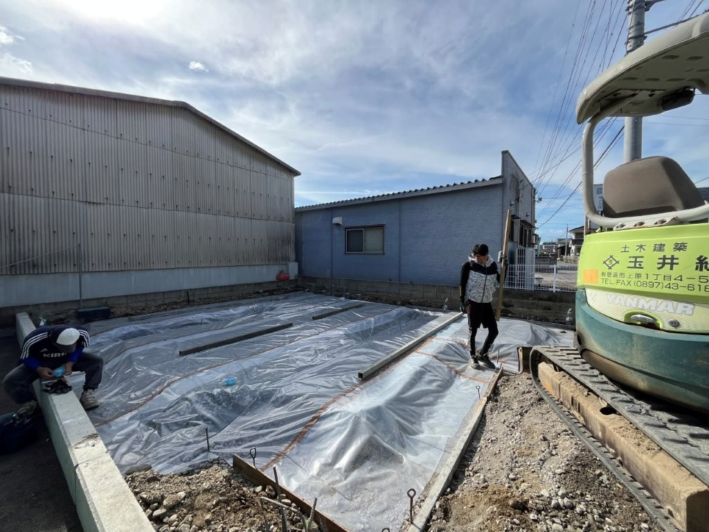 基礎工事が始まりました。下の写真は、砕石の上に防湿シートを貼っている様子です。
