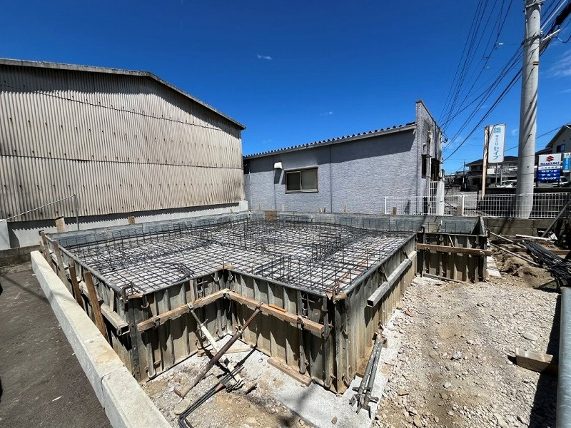 上の写真からさらに1週間後の様子です。型枠工事と基礎配筋工事が完了しました。このあと配筋検査を受け、合格後にコンクリートを打設します。