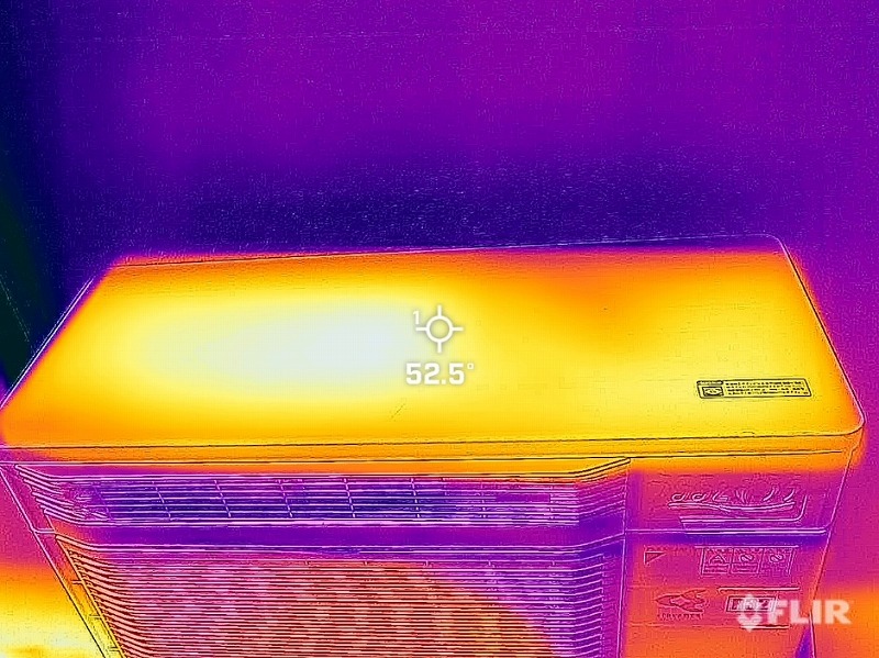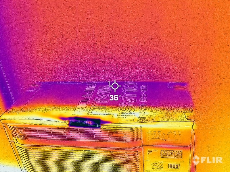 さて、実験の結果ですが、下のサーモグラフィーの写真をご覧ください。スマホにいれたFLIRというサーモグラフィックカメラで撮影したもので、上が遮熱シートなしで天板の温度が52.5℃、下が遮熱シートありで天板の温度が36℃。明らかに室外機の温度が下がっています。そして、エアコンの効きも明らかに変わり、朝出社してエアコンをつけると、今までの半分以下の時間で事務所が冷えるようになりました。