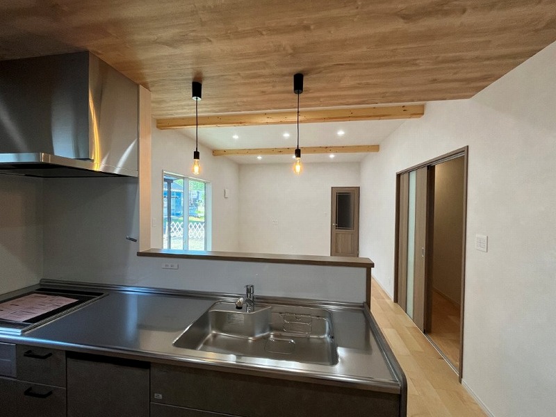 別の角度から見たLDK。キッチンには下がり天井を採用しています。ゆるやかに空間を区切れるうえ、段差の視覚効果でリビングが広く感じられます。最近はこうした下がり天井を取り入れるケースが増えてきています。
