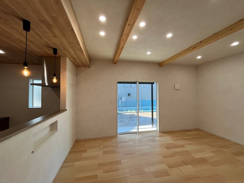 建物南側の明るいLDK。梁あらわしのナチュラルな印象の空間です。
