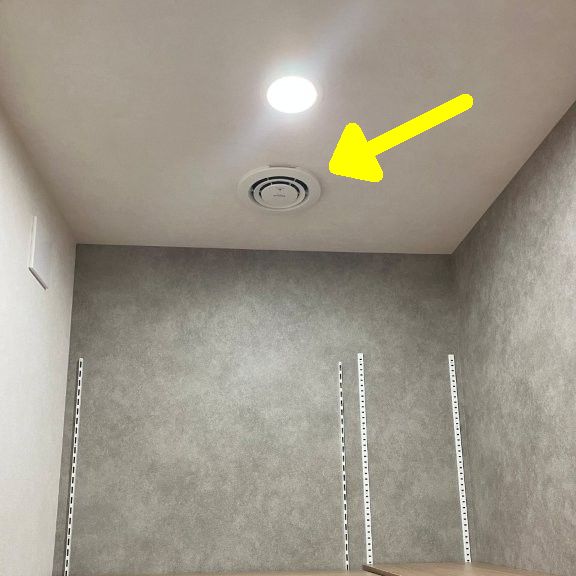 矢印で示した丸い機械は、パナソニックの天井埋込式ナノイー発生機です。オープンタイプのシューズクロークを採用されたり、ペットを飼われているご家庭で、臭い対策として採用されるケースが最近増えてきています。ナノイー技術は臭い対策としてかなり効果があるようで、テレビで焼肉の臭いを付着させた服が一瞬で無臭になる実験を見た記憶があります。シューズクロークにナノイー、検討の価値がある設備だと思います。