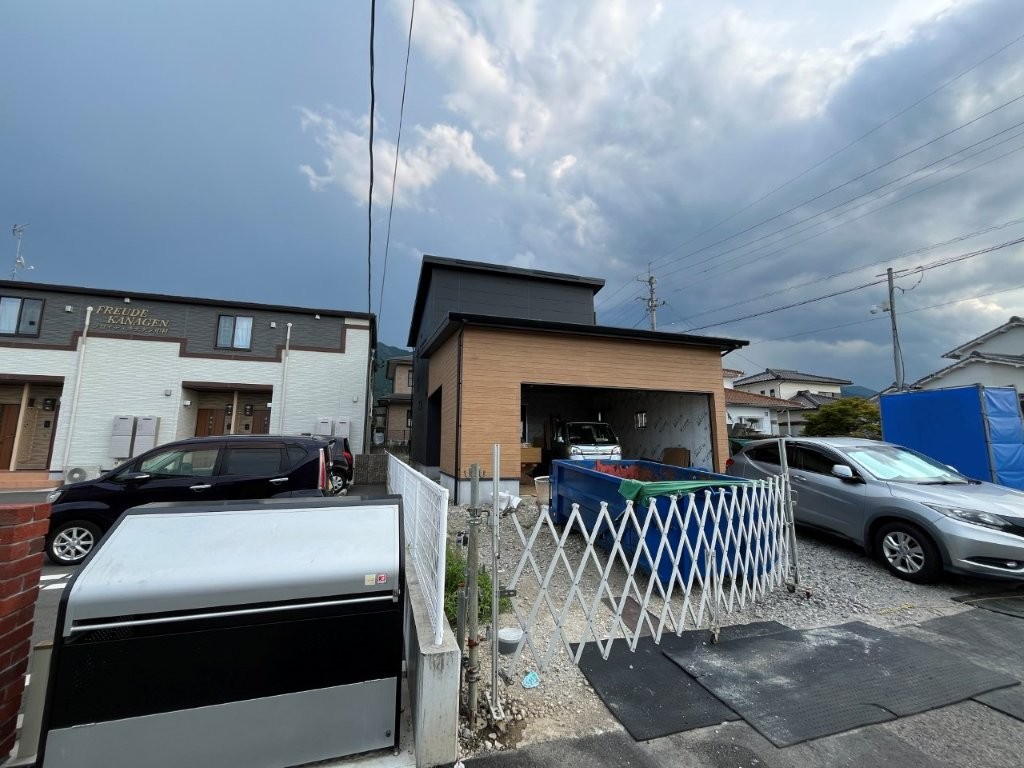 外壁工事が終わり、足場が外れました。Y様邸の特徴である大きなインナーガレージが姿を表わしました。近くで見ると、なかなか迫力のある外観です。