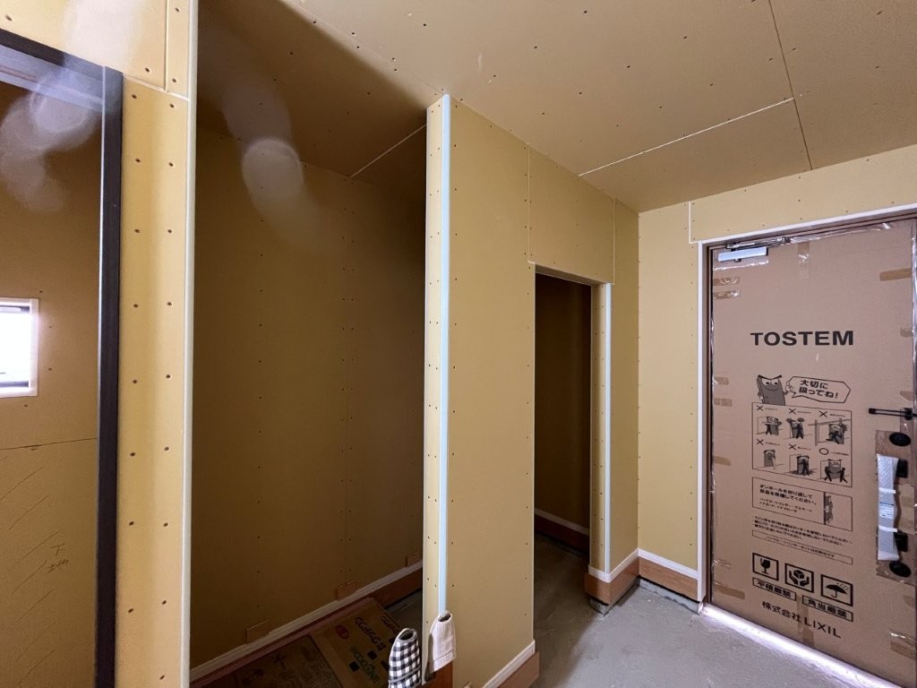 家の中では着々と大工工事が進んでいます。下の写真は玄関の土間収納です。