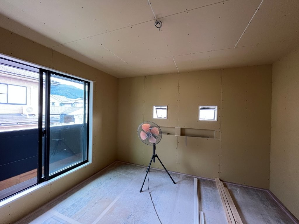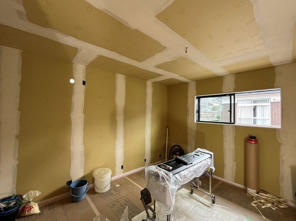 家の中では壁紙工事が始まっています。下の写真は、パテ処理の様子です。下地材の継ぎ目やビスの頭を丁寧に均していきます。