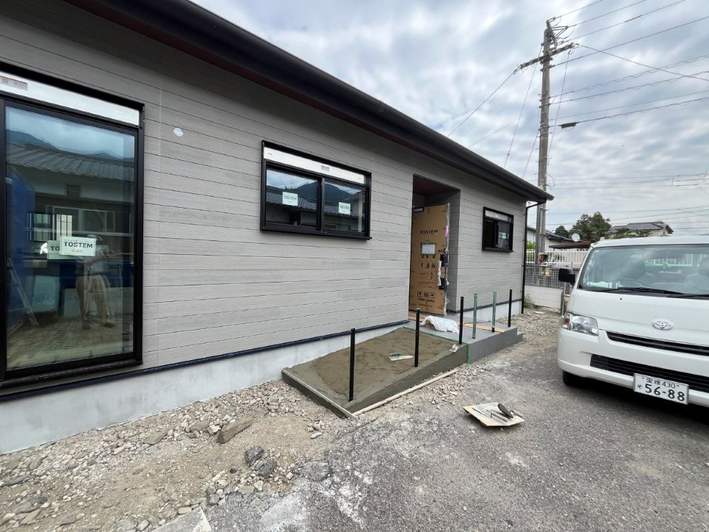 F様邸も外壁工事が完了し、足場が外れました。下の写真は、玄関前のスロープと手すりを作っている様子です。バリアフリーの家が着々と形になりつつあります。