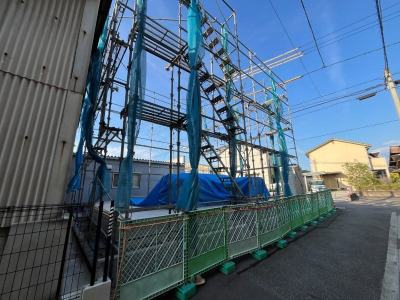 今回採用したのは「芯掛け足場」。東京や大阪ではよく見かけますが、新居浜ではほとんど目にしないタイプです。踏み板をつないだ通路の真ん中に支柱が入るため、歩くときに支柱をよけなければならない、ちょっと不便な足場です。本来は支柱の外側に通路を作るのですが、今回は隣家との距離が狭く、通常の足場が組めないため、やむを得ず芯掛け足場を採用しました。