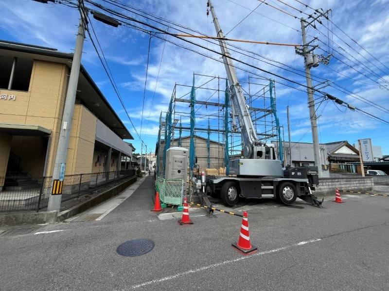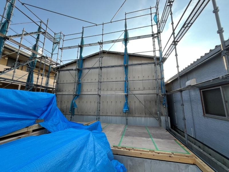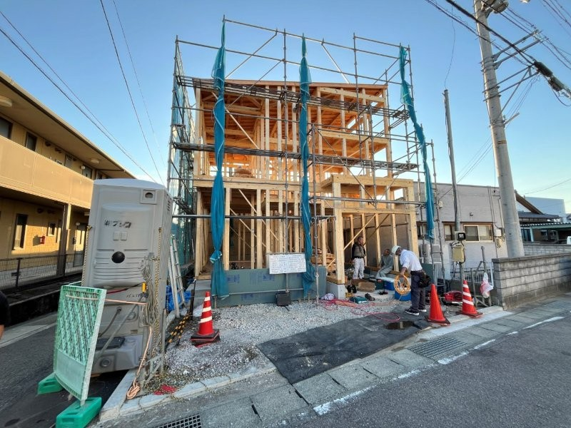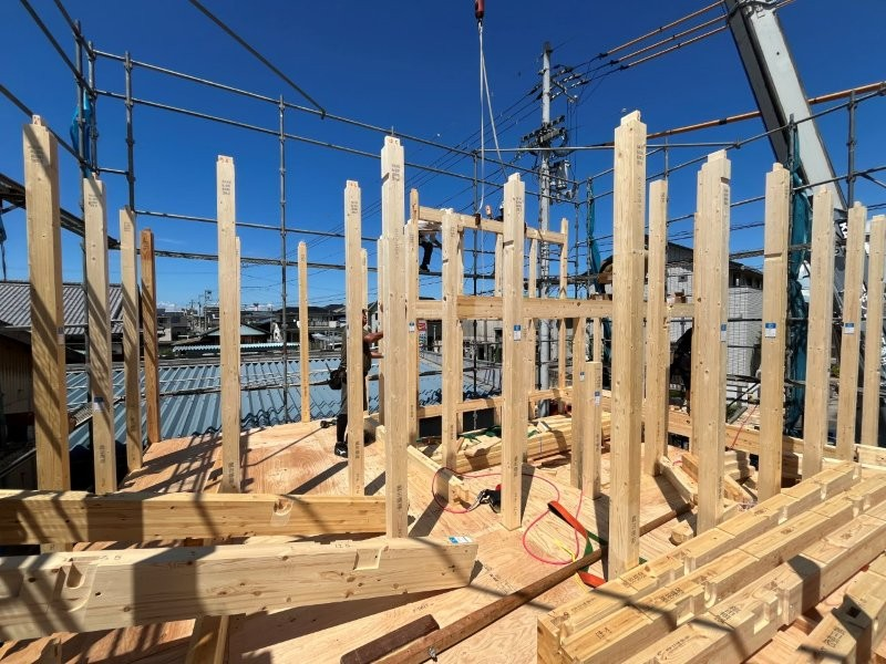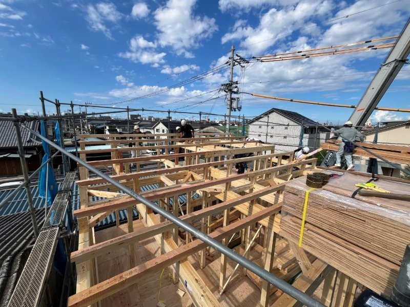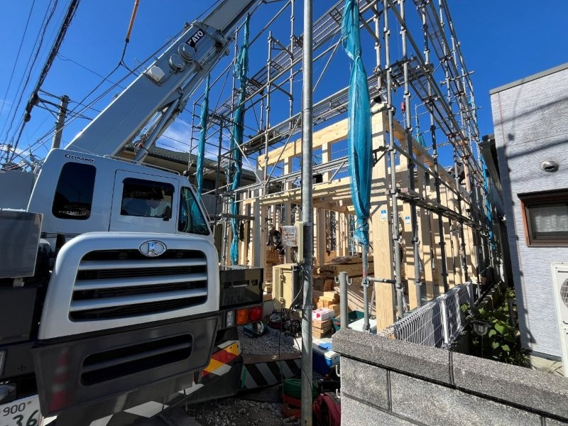 8月21日と22日の2日間にわたり、K様邸の上棟を行いました。正面に架かる配電線、敷地ギリギリまで迫る隣家の建物、さらに交通量の多い前面道路など、なかなか手強い立地条件です。スタッフ一同「史上最大の作戦」と名付けて、気合を入れて挑みました。