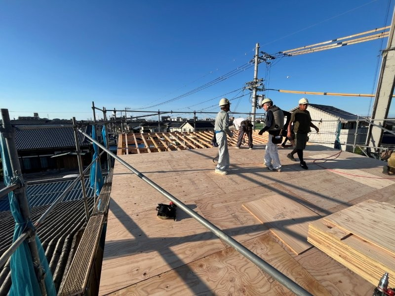 野地板(屋根の下地材)を貼っていきます。あと少しです。