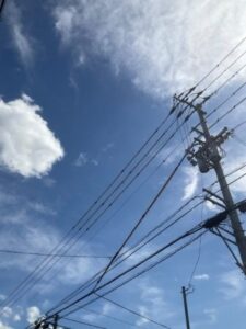 この写真は、河内町K様邸の前面道路に架かる配電線を撮ったものです。上棟時の感電防止のために、四国電力送配電株式会社に絶縁カバー(保護管)の取り付けを依頼していたのですが、作業完了の連絡をもらったので、その現況確認に行ったときの一枚です。