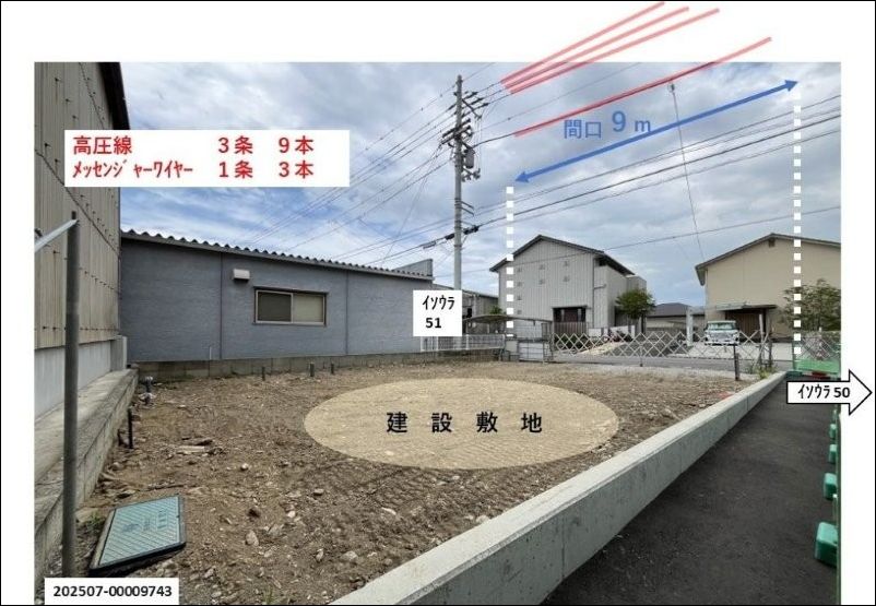 下の資料は、四国電力送配電株式会社から、見積もりといっしょにもらったものです。絶縁カバーの取り付けが必要な範囲が書かれていて、全部で4条(条=ひと束という意味)の配電線にたいして、間口9メートル分の施工が必要ですよ、という内容になっています。