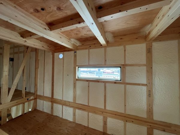 こちらは2階洋室(1)の写真。壁にも天井にも、ウレタンフォームをたっぷりと吹き付けています。