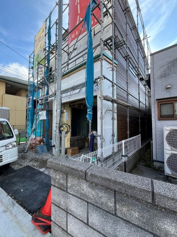 こちらは建物西側の外壁工事の様子。隣地境界までの距離は60センチありますが、敷地ギリギリまで建物が迫っているため、より慎重に作業を進めていきます。若い職人さんが体をねじるように動かしながら外壁材を貼ってくれました。お疲れさまです!