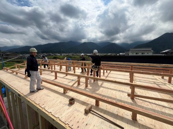 9月末に上棟を行いました。下の写真は、梁と桁を組み上げたところです。
